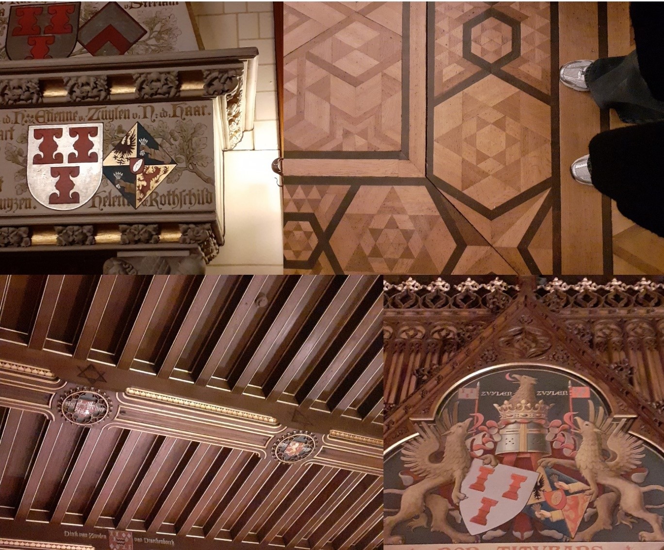 Very interesting are the frequent references to the Jewish heritage and family background of the baroness at De Haar. The Rothschild coat of arms appears above the fireplace in the library, and above a doorway in the Knight's Hall, next to the Van Zuylen coat of arms. The heraldic symbol of a hand with five arrows, representing the five sons of Mayer Amschel Rothschild and Gutle Schnapper, who founded the Rothschild banking house, are clearly visible at floor-level. In the Knight’s Hall, Magen Davids were applied to the Medieval beams, while the six-pointed star was also incorporated in the floor of another room on the ground floor. Around 1900, the family crest uniting the Van Zuylens and the De Rothschilds – writing the latter into the history of an ancient Dutch-Flemish noble family – also featured on many utensils used around the home, such as on bed and bath linen, and on coach doors.