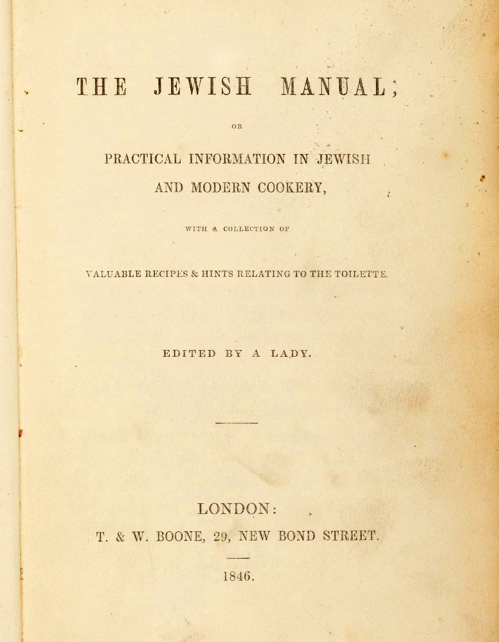 The Jewish Manual (1846) was the first Jewish cookbook in English. It was compiled by Lady Judith Montefiore with help from her social circle. She wanted to show that a kosher home, where the household observed Jewish food laws and other rituals, could also be refined, respectable – and English.